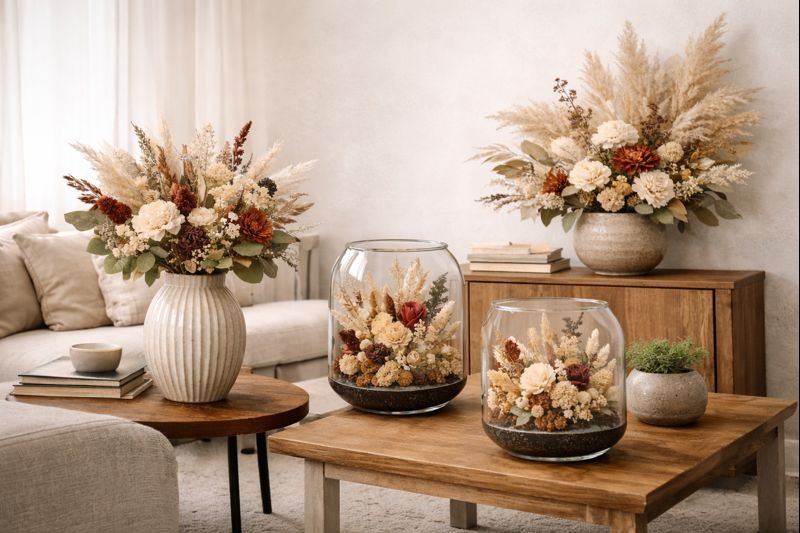 Nossos buquês e terrários se adaptam perfeitamente a diferentes estilos de ambientes, do minimalista ao contemporâneo, trazendo aconchego, personalidade e um toque natural à decoração.